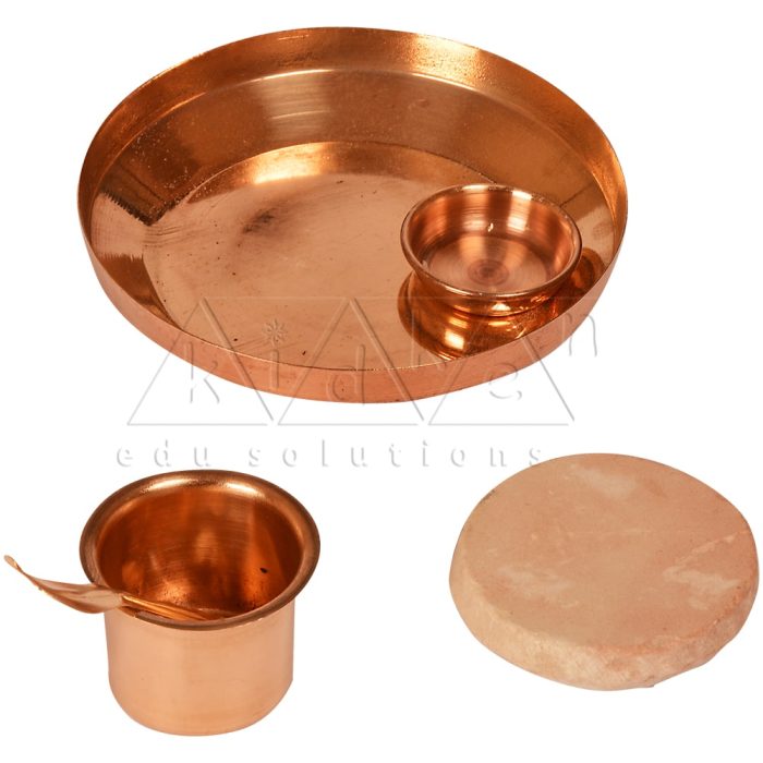 - Components: Copper plate, one copper pooja spoon, one copper bowl and chandan grinding stone. Does NOT come with Chandan Stick