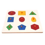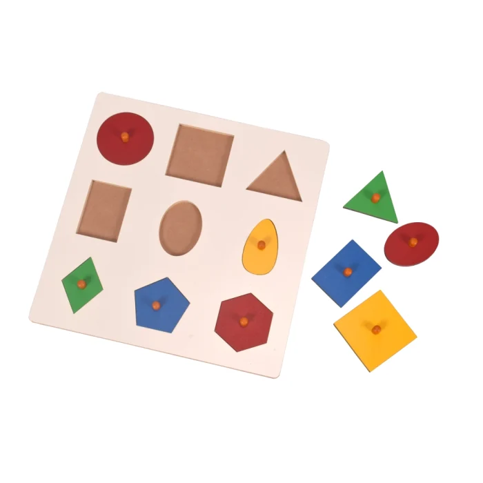 MATERIAL DESCRIPTION: Geometric shape Inset Board with knobs great for babies 16 – 36 months old beautifully painted with vibrant colors.