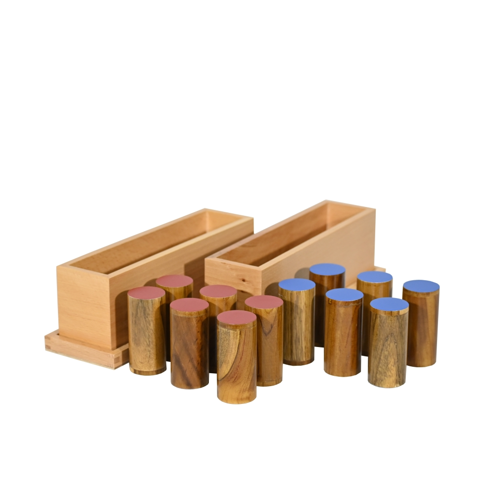 Includes 6 pairs of cylinders that produce different intensities of sound when shaken. 6 of them painted red on the cap and 6 of them painted blue for differentiation during pairing and gradation. The cylinders are stored in in two high quality wooden boxes.